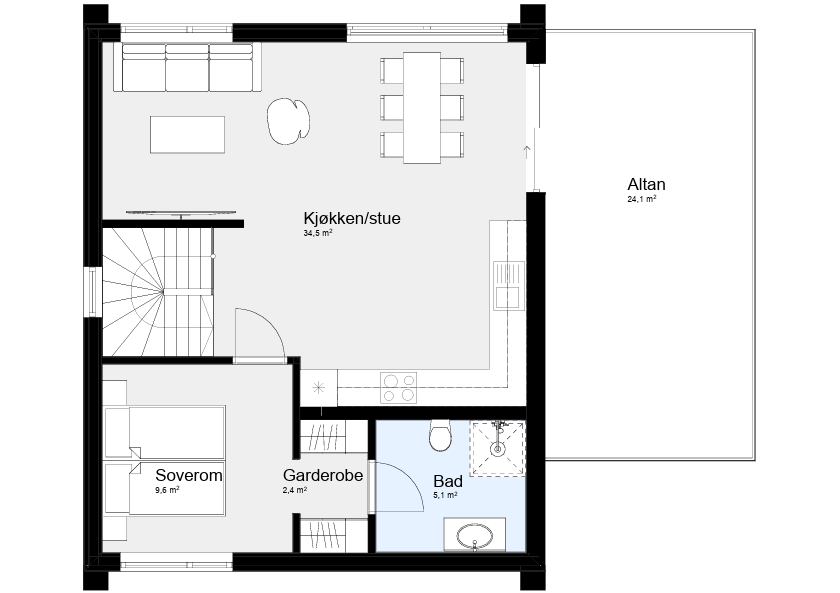 I andre etasje åpner boligen seg opp med en stor stue- og kjøkkenløsning og åpen himling som gir rommet ekstra høyde og karakter. Store vindusflater sørger for mye dagslys og en naturlig kontakt med uteområdet. Den sømløse overgangen til den romslige altanen gjør Lier perfekt for hyggelige stunder.