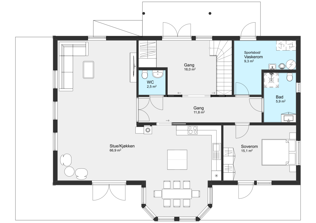 I første etasje får du alle nødvendige funksjoner samlet, inkludert en stor og åpen stue- og kjøkkenløsning. I andre etasje finner du tre store soverom, alle med egne walk-in garderober, to altaner og en loftstue med god plass til både lek og avslapning.